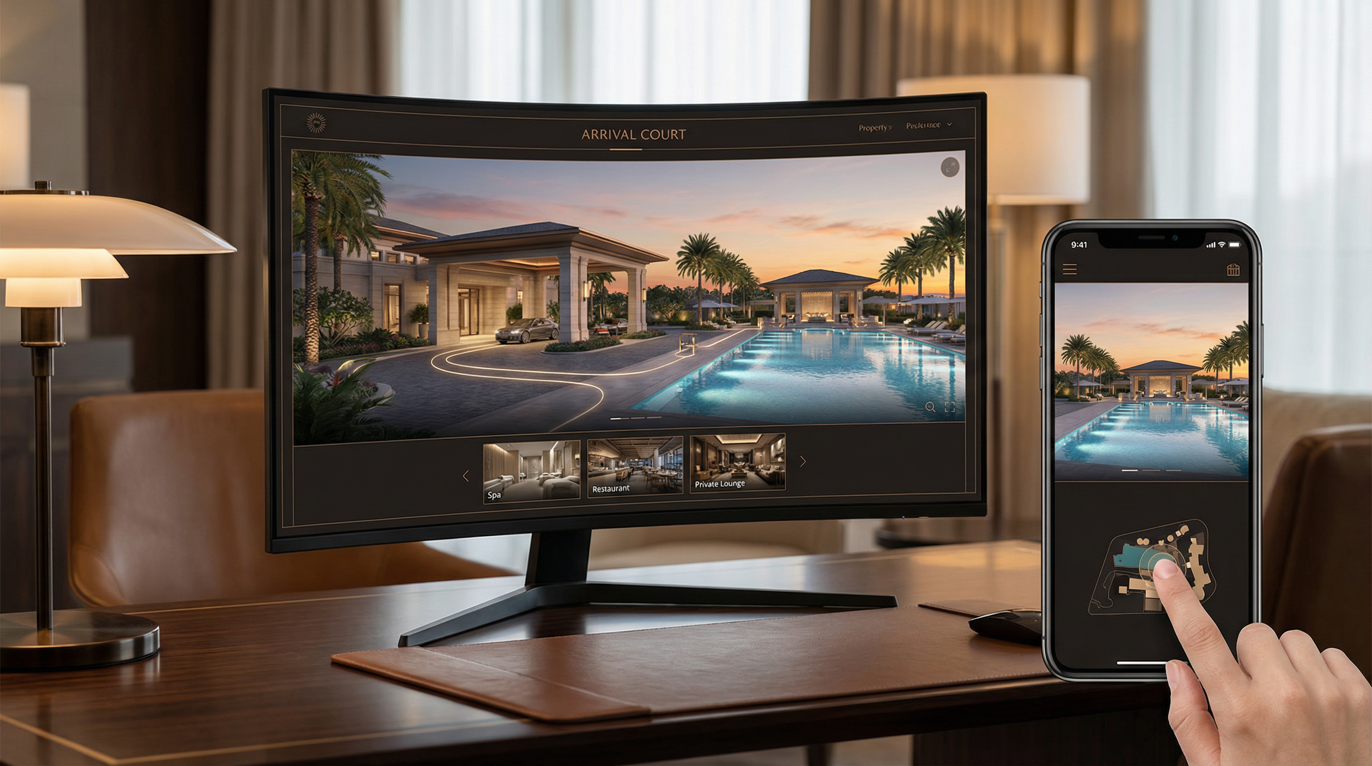 Interactive experiences that walk guests through arrival, amenities, circulation, and destination moments.